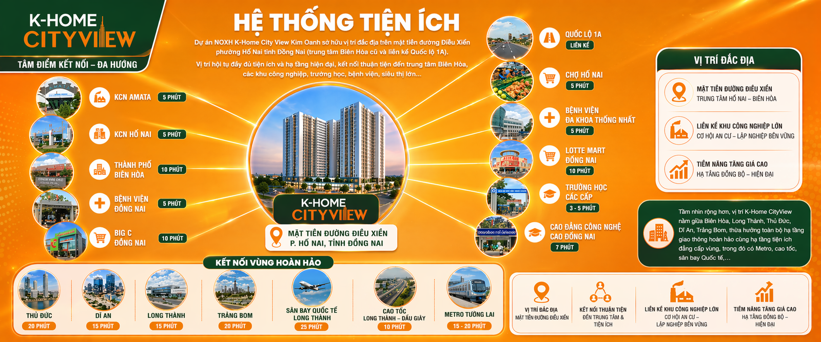 Đặc biệt, K-Home CityView nằm liền kề các khu công nghiệp lớn như Biên Hòa 1, Biên Hòa 2 và Amata tạo nên nguồn cầu nhà ở bền vững, vừa mang lại tiềm năng khai thác cho thuê, vừa đảm bảo giá trị bất động sản tăng trưởng ổn định trong tương lai.